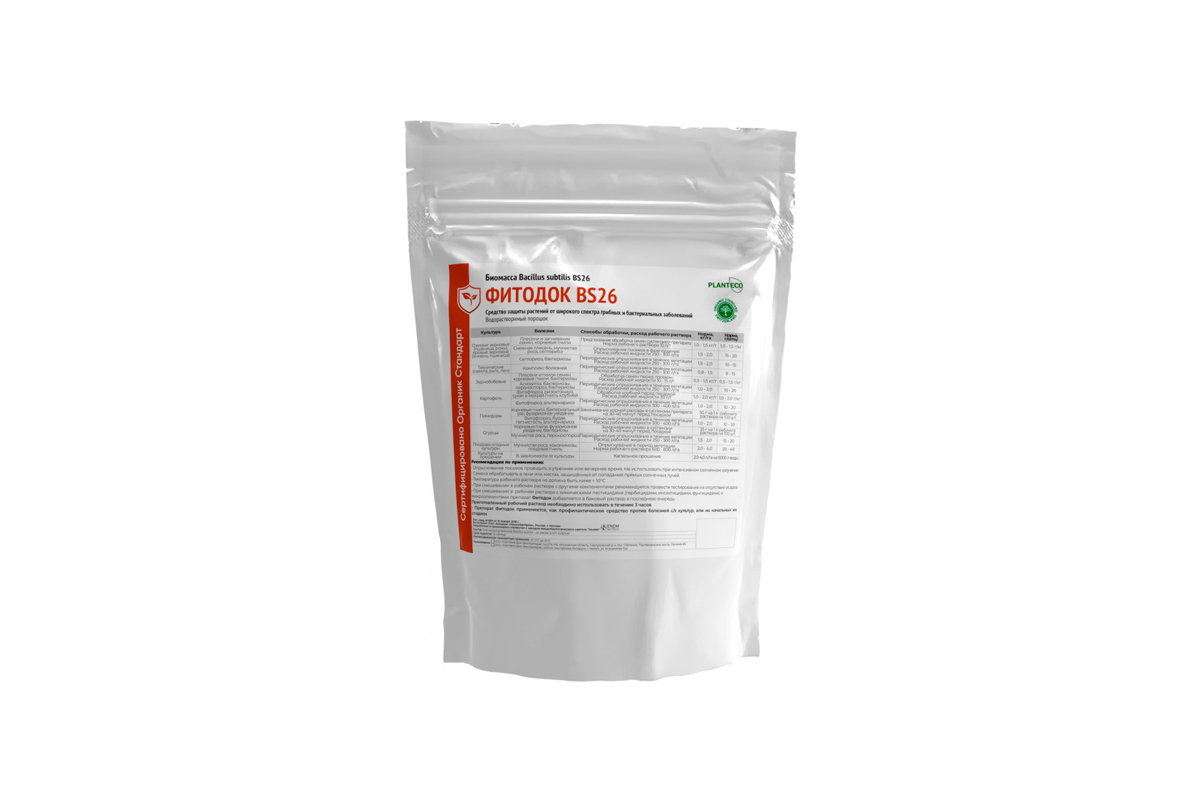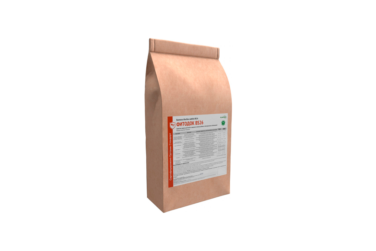 Биомасса Bacillus subtilis Фитодок BS26 - полифункциональный активный биологический комплекс широкого спектра действия для содействия в профилактике комплекса болезней растений, вызванных фитопатогенными грибами и бактериями на основе живых клеток и спор бактерий Bacillus subtilis и продуктов их метаболизма (биологически активные вещества).